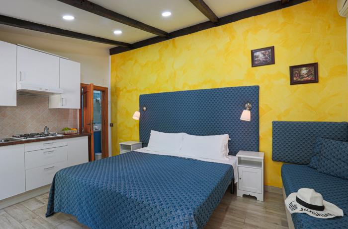 Studio apartment with balcony and garden view, from 02 to 03 people, with independent air conditioning and free WI-FI, consisting of double bed, single sofa bed, private bathroom with shower, fully equipped kitchenette with crockery, pots and utensils, access direct to the large private garden with gazebo for exclusive use furnished with sofas, table and armchairs. Dedicated relaxation area with deck chairs, umbrella and hammock. Both bed linen and towels are included.